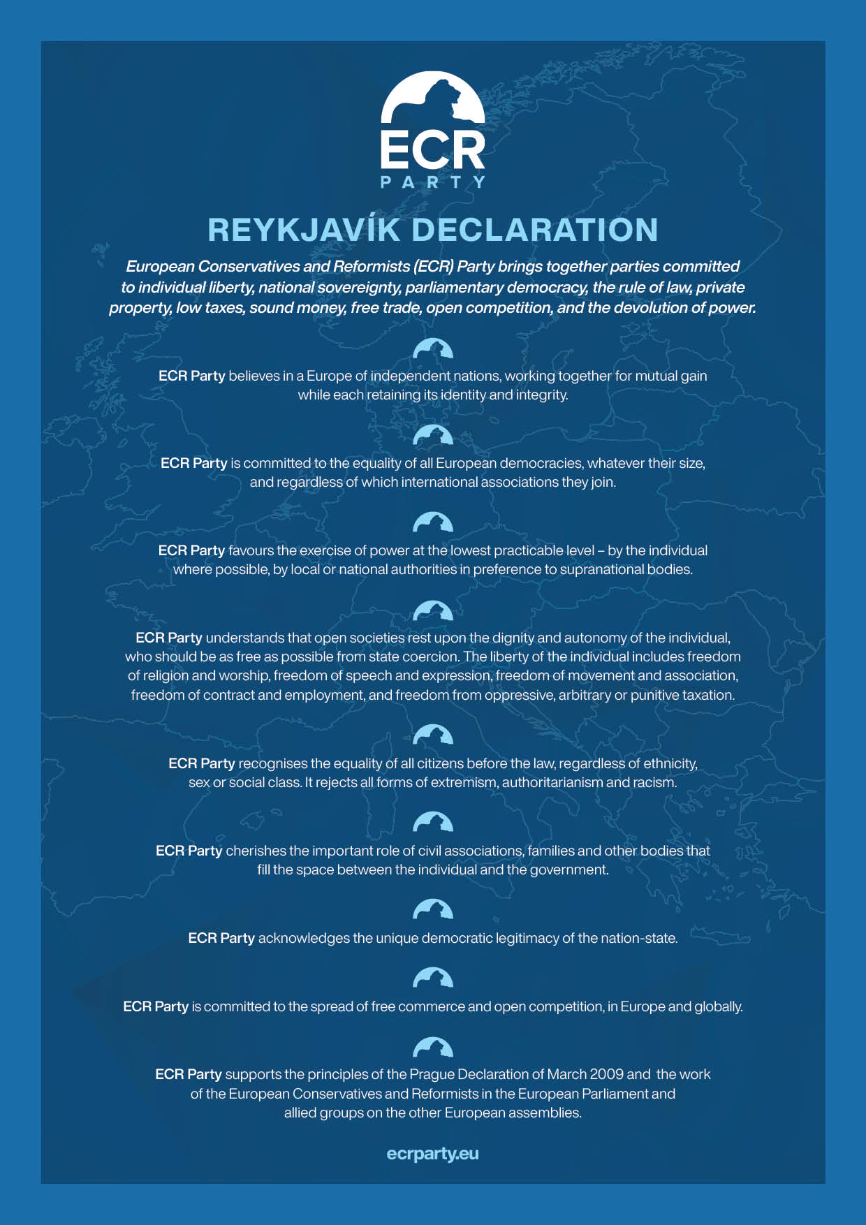 Partia Europejskich Konserwatystów i Reformatorów (ECR) jest najszybciej rozwijającym się ruchem politycznym w Europie. Założona w 2010 roku przez Brytyjską Partię Konserwatywną, dzisiaj ECR jest trzecią największą europejską rodziną polityczną z ponad 42 krajowymi partiami i grupami członkowskimi w Parlamencie Europejskim, Radzie Europy, Komitecie Regionów, Zgromadzeniach Parlamentarnych OBWE i NATO. Zjednoczeni przez centroprawicowe wartości wyrażone w Deklaracji z Reykjaviku, ECR promuje wolność osobistą, suwerenność narodową, demokrację parlamentarną, własność prywatną, ograniczone rządy, wolny handel, wartości rodzinne i decentralizację władzy zarówno w Europie, jak i na całym świecie.