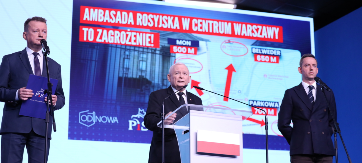 Prezes PiS J. Kaczyński: Dzisiejsza konferencja poświęcona jest propozycji uchwały, aby zmienić miejsce siedziby ambasady rosyjskiej. To miejsce jest bardzo szczególne. To część dawnego ogrodu MON i to ministerstwo jest tuż obok, ulica Parkowa, KPRM, Belweder. To, że w okresie stalinowskim tam umieszczono ambasadę miało też wymiar symboliczny. Dziś jest stosowny moment, żeby skończyć z tą nienormalną sytuacją. Projekt tej uchwały, przygotowany przez Marcina Ociepę, będzie za chwilę złożony w Sejmie i mamy nadzieję, że nie znajdzie przeciwników. Podejmujemy tą ważną sprawę dla naszego bezpieczeństwa, bo istnieje bardzo poważne zagrożenie i ma to też bardzo symboliczny wymiar.